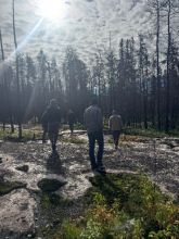 At Nopiming Provincial Park, attendees visited Black Lake Campground to observe wildfire damage and discuss Manitoba Parks’ coordinated response, infrastructure loss, and the impacts on woodland caribou habitat.
