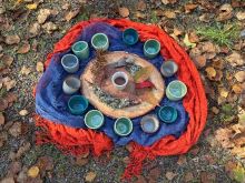 Images: Participants hike through a fire-scarred landscape in Nopiming Provincial Park, observing ecological recovery in a recently burned area (above). Vibrant scarves encircle delicate teacups, creating a warm and inviting setting for reflection or conversation (below).