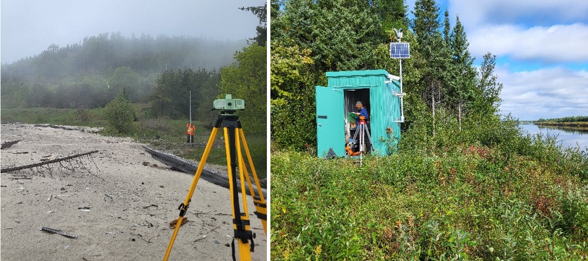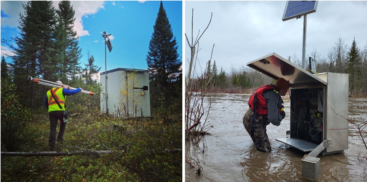 Right: Michael Dodd-Smith reviewing logger data during a high-water event at station 02AB027 – Whitefish River Near Stanley, 2025-04-29 (photo by Tanner Booth).