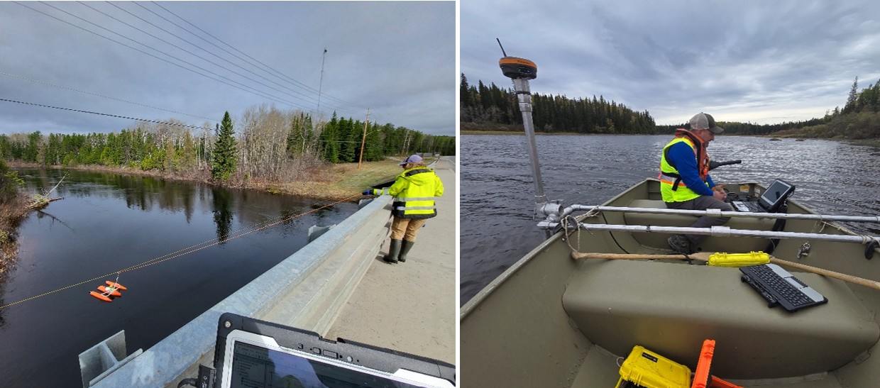 Left: Lauren Bourke towing a tethered boat across the Blackwater River, Beardmore, ON, to measure the discharge with an Acoustic Doppler Current Profiler (ADCP), 2025-05-15 (photo by Tanner Booth).