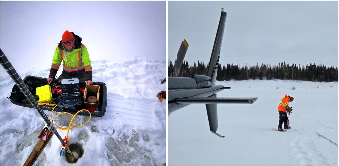 Left: Tanner Booth monitoring live flow data being collected under the ice on the Pic River, near Marathon, ON, 2025-01-16 (photo by Sean Arruda).