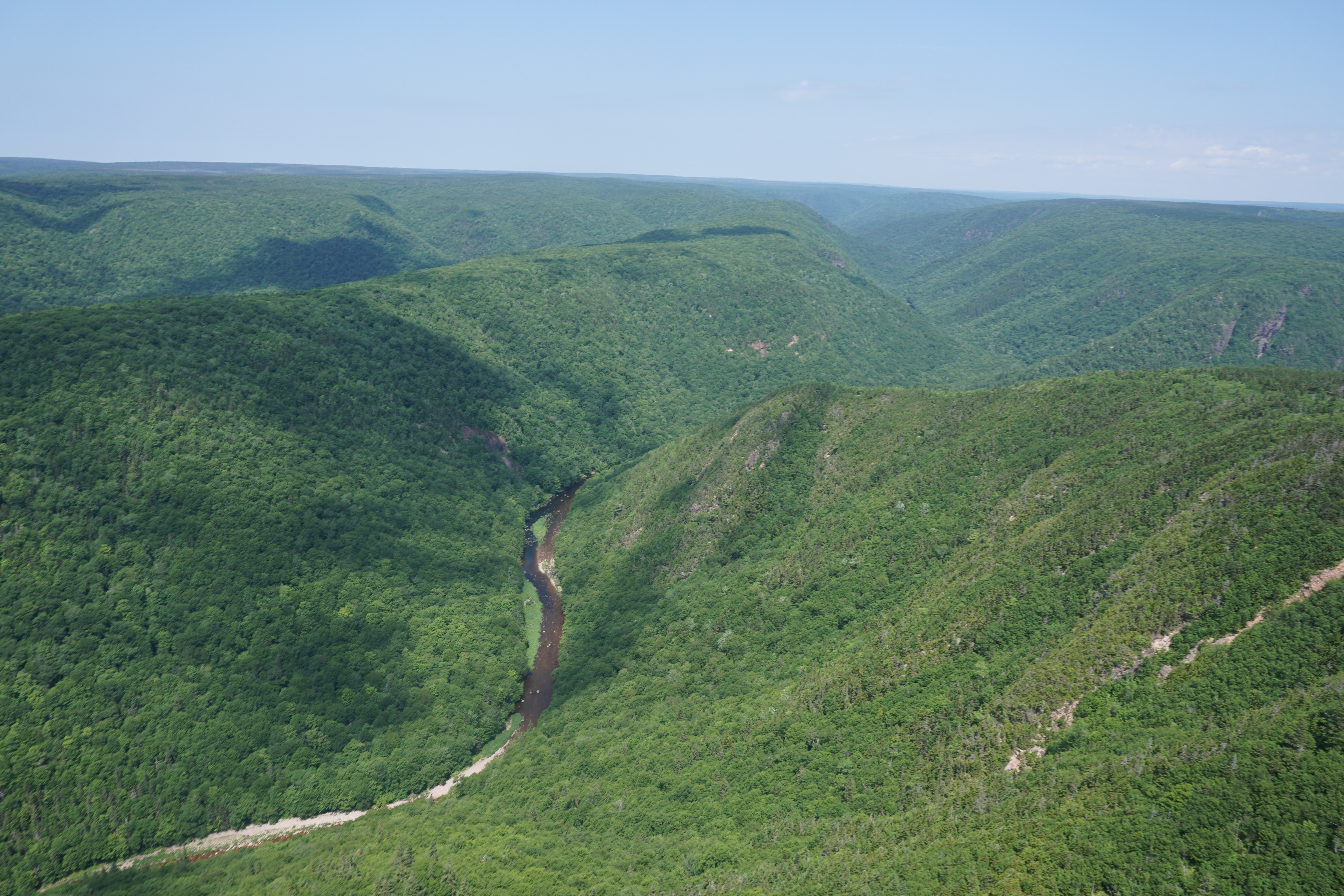 The complex and spectacular geology of Cape Breton is visible along this river system, with Karst sinkholes that are remnants of the supercontinent Pangaea, faults that provide evidence of the continental collisions that formed the Appalachian mountain chain, and v- and u-shaped valleys, moraines and braided channels that showcase the effects of glaciation.