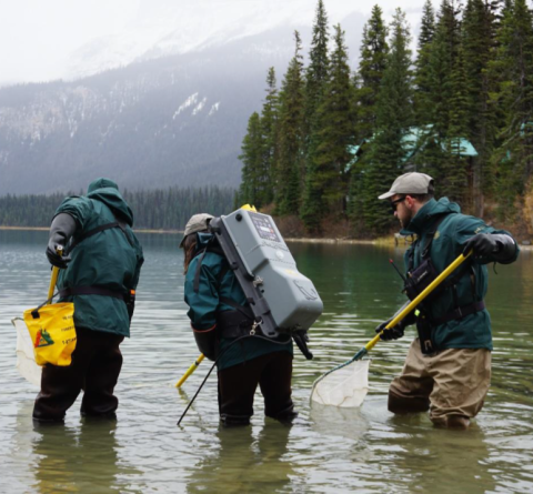 Image: Le personnel de Parcs Canada pêche à l'électricité dans le lac Emerald, dans le parc national Yoho, pour vérifier la présence du tournis des truites.